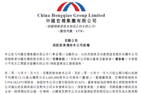 中國(guó)宏橋近日發(fā)布公告稱(chēng),其控股股東宏橋控股知會(huì)公司,將于2017年11月6日從公開(kāi)市場(chǎng)以每股均勻價(jià)約12.51港元購(gòu)置合共644.3萬(wàn)股公司股份。緊隨購(gòu)置后,宏橋控股現(xiàn)持有約59.54億股股份,相當(dāng)于公司已發(fā)行股份約82.02%。記者從公開(kāi)材料查詢(xún)后發(fā)現(xiàn),宏橋控股為公司執(zhí)行董事及董事會(huì)主席張士平間接全資具有的公司。